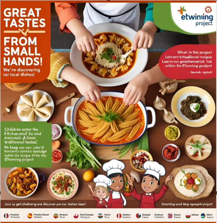 2024 2025 Eğitim öğretim yılında kurumumuzda uygulanan "Küçük ellerin büyük dokunuşlarıyla lezzetlerimiz" isimli eTwinning projesinin afiş geliştirme çalışmaları kurumumuz tarafından gerçekleştirildi. Oluşturulan afiş onaya sunuldu.